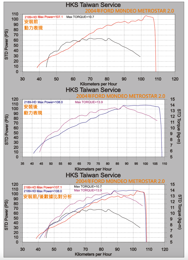 某月某日星期六 上午6點半於66快速道路 國一至大溪端路段 極速表現: 安裝前極速180km/h 安裝後極速200km/h 拉速表現: 安裝前100km/h-150km/h---10sec 安裝後100km/h-150km/h----7sec 油耗表現: 安裝前每桶油平均跑400km左右 安裝後每桶油平均跑500km以上 安裝前馬力/扭力 107.1PS / 10.7kg-m 安裝後馬力/扭力 108 • PS / 13.9kg-m